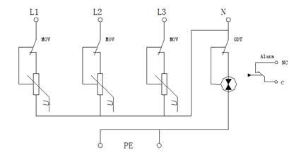 DXH06-FC621/3+1交流電源電涌保護(hù)器用于交流電源的第二級(jí)(C級(jí))雷電過電壓保護(hù),采用3+1防護(hù)電路,如下列圖形所示。